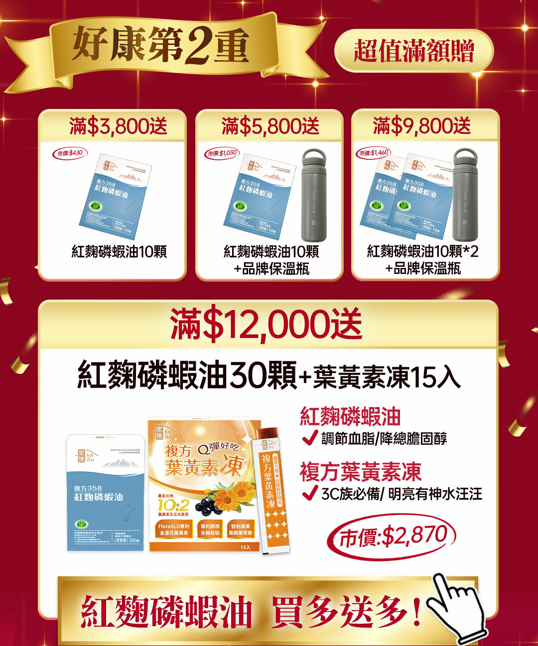 ※滿$3,800贈紅麴磷蝦油10顆1入、滿$6,800贈紅麴磷蝦油10顆1入+品牌保溫瓶1入、滿$9,800贈紅麴磷蝦油10顆2入+品牌保溫瓶1入、滿$12,000贈紅麴磷蝦油30顆1入+複方葉黃素凍15包1入