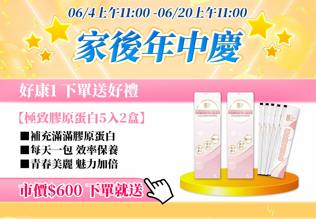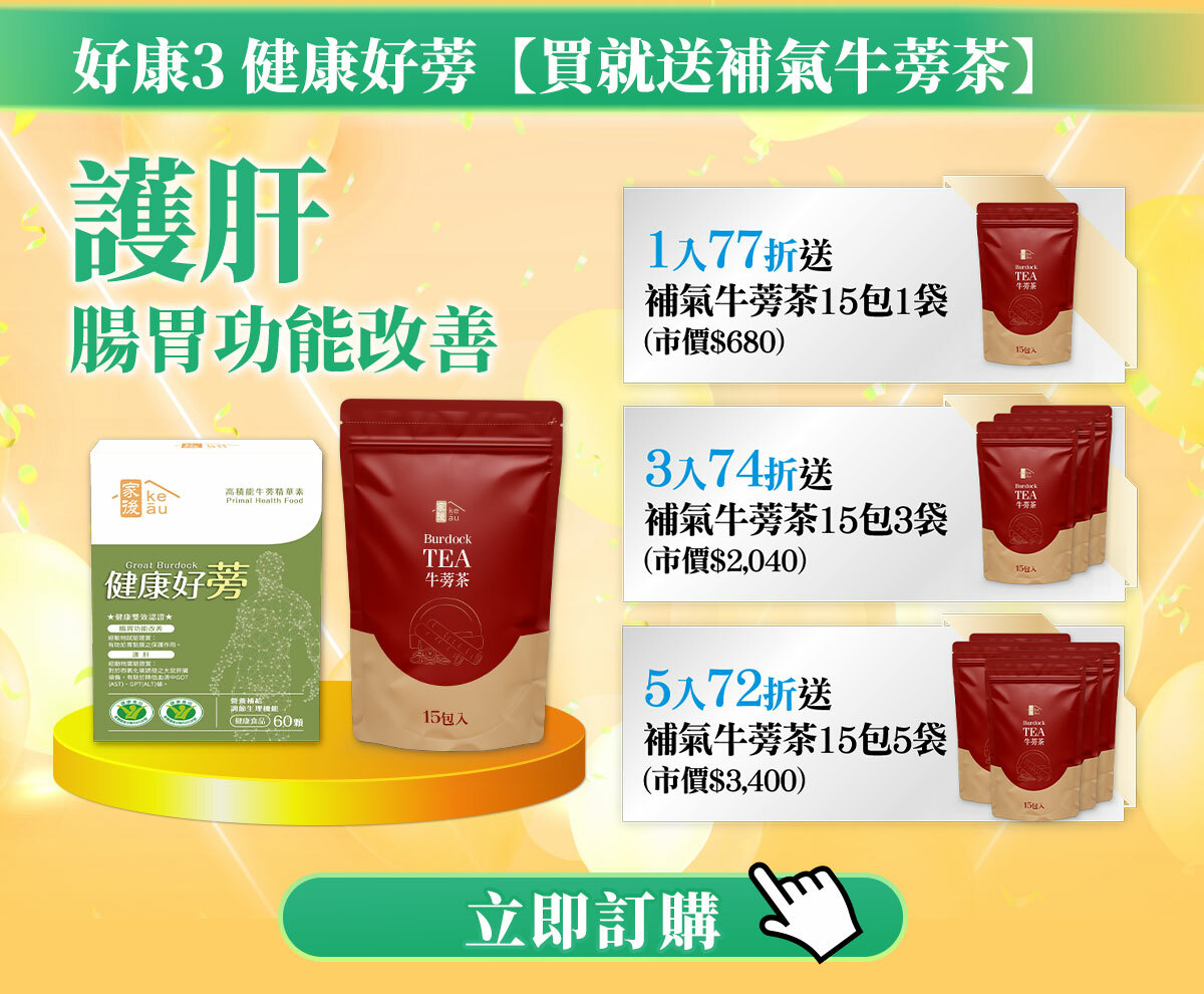※好禮2:健康好蒡最低72折,再贈牛蒡茶15包,含下單贈最多牛蒡茶15包5袋+膠原蛋白5入2盒(市價$4,000)直接帶走。