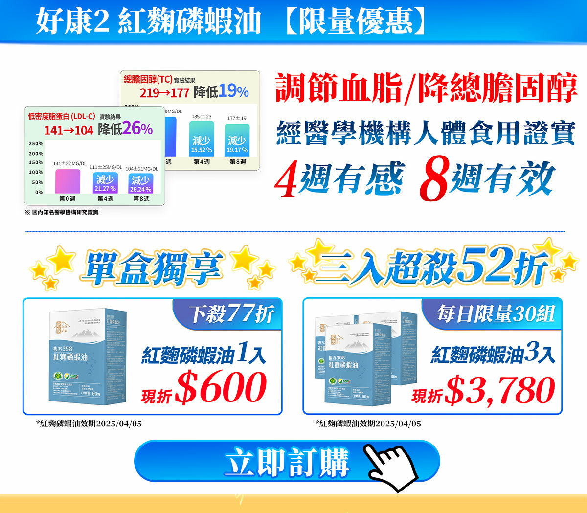 ※好禮1:紅麴磷蝦油最低52折(每日限量30組,效期至2025/4/5)。