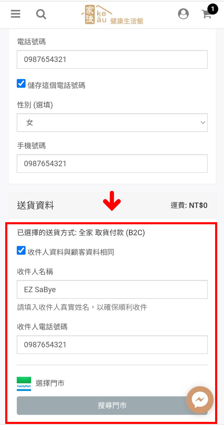 七、送貨資料可直接勾選【收件人資料與顧客資料相同】,並選擇收件門市或收件地址即可。
