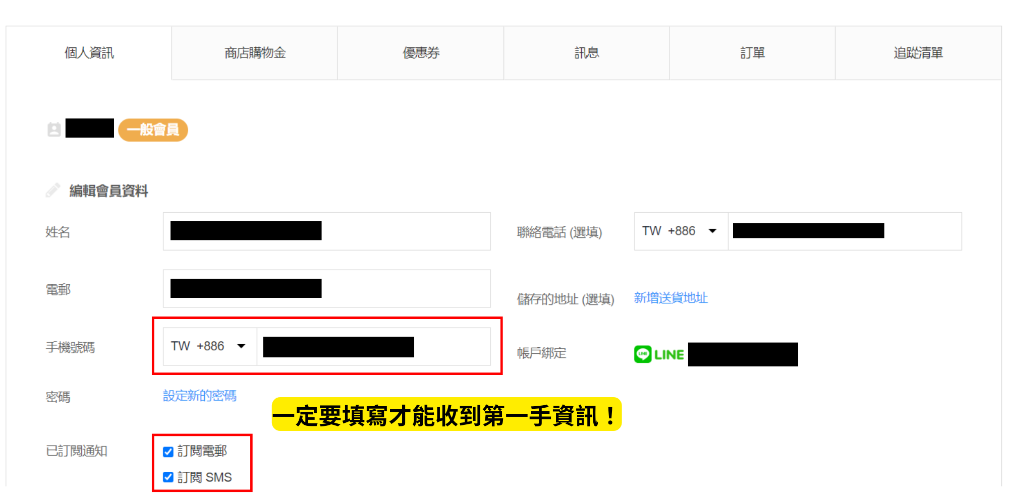 四、 填寫您的會員資料,一定要填手機號碼與勾選訂閱通知,才能收到會員獨家優惠折扣!