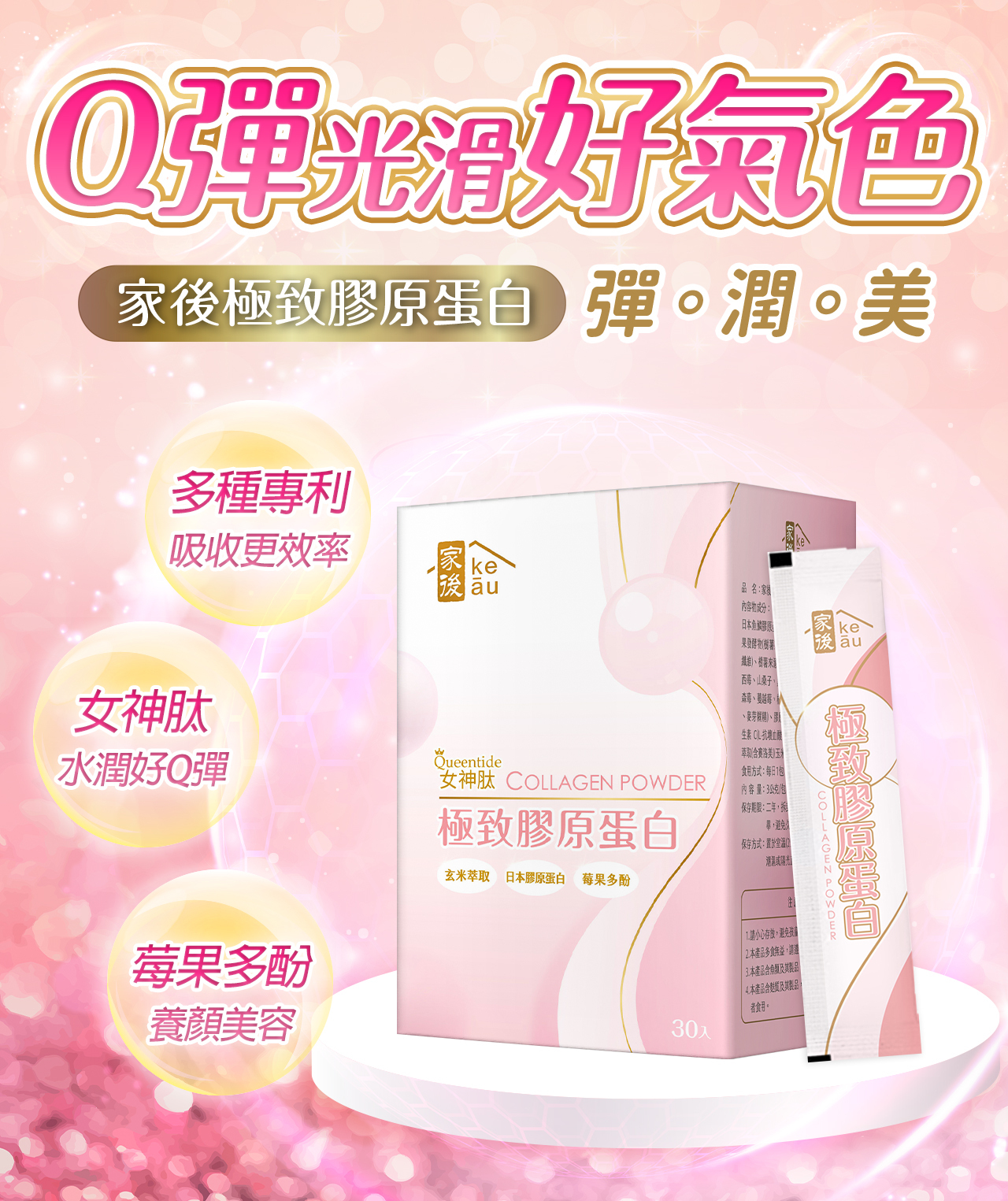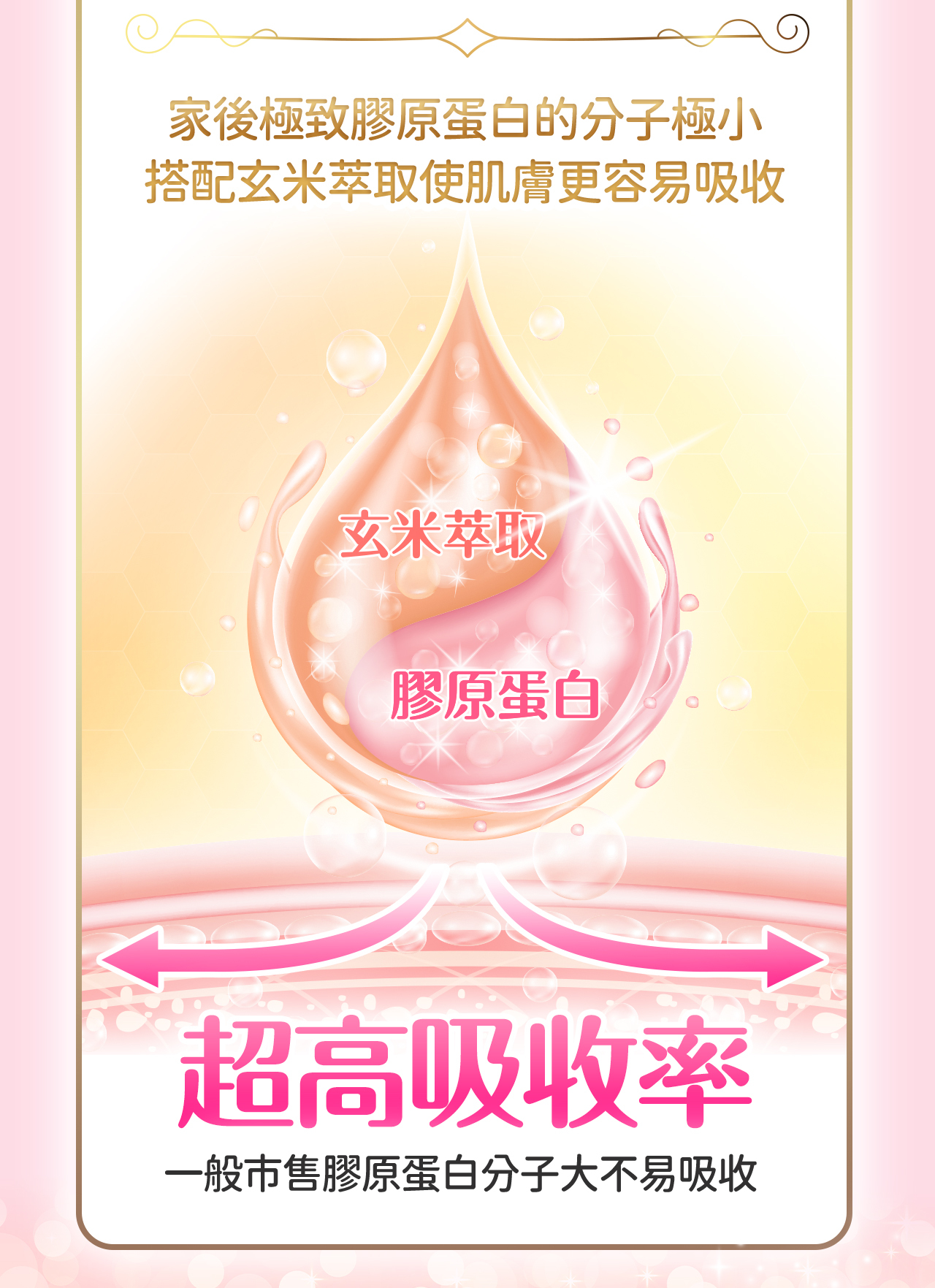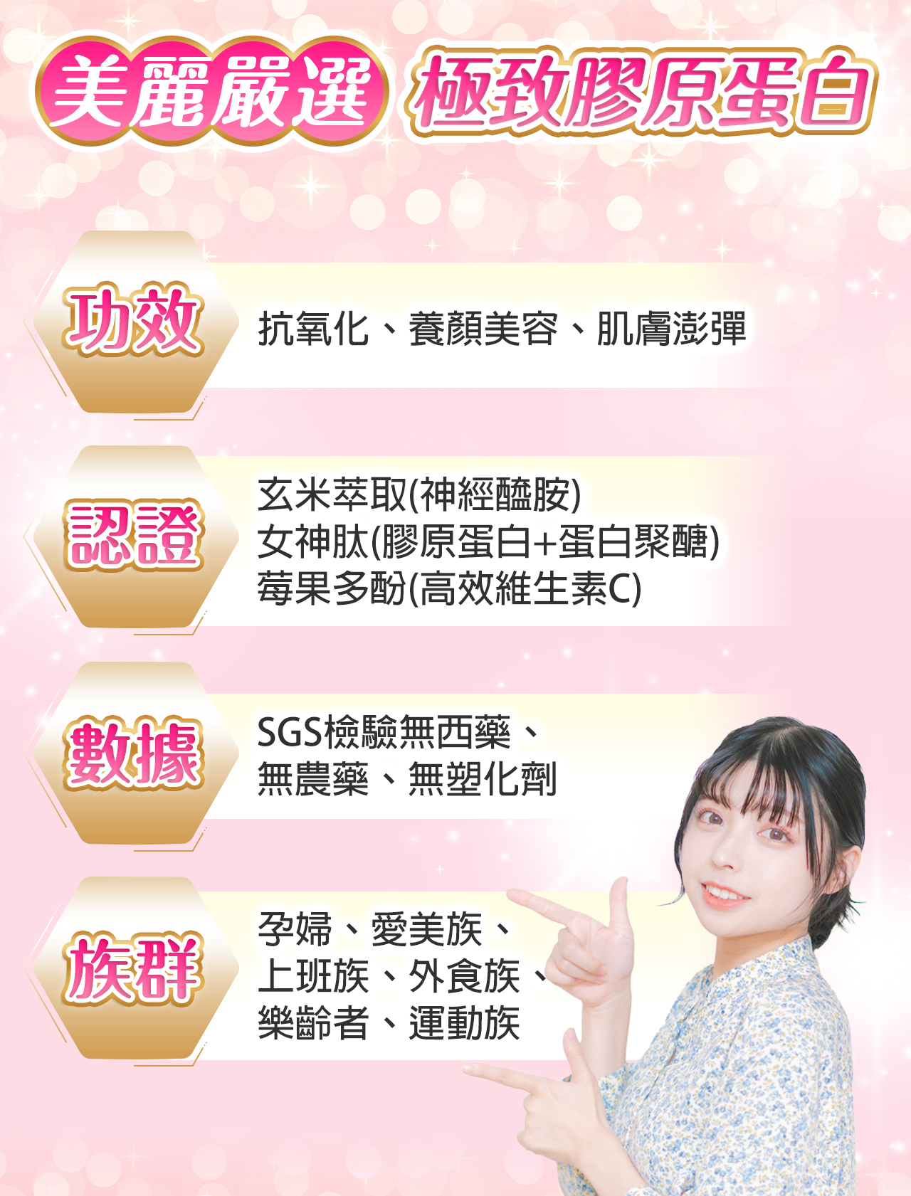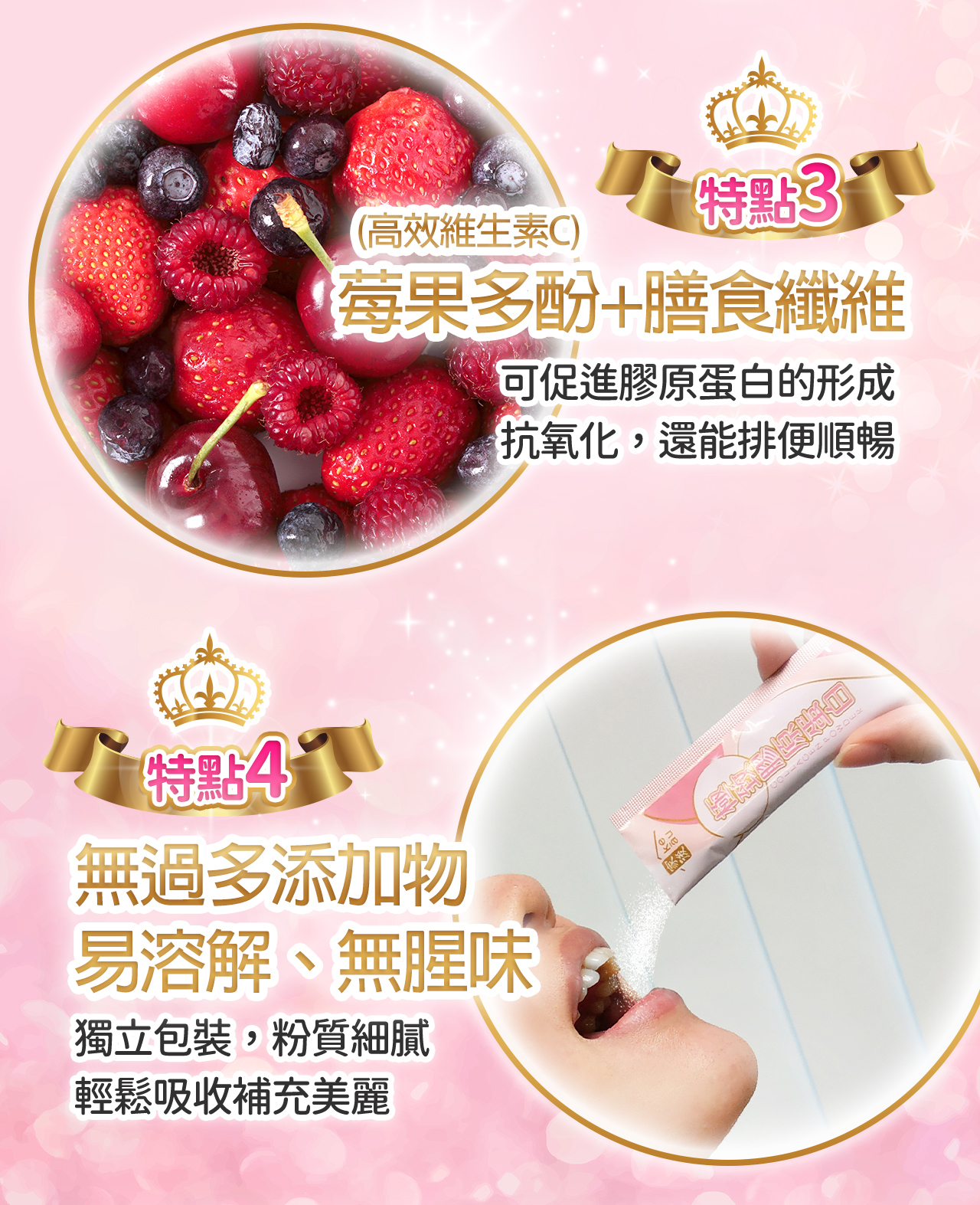 | 成分 | 日本魚鱗膠原蛋白、玉米來源可溶性纖維、綜合莓果發酵物(樹薯來源難消化性麥芽糊精(水溶性膳食纖維)、樹薯來源麥芽糊精、接骨木莓、野櫻莓、巴西莓、山桑子、黑醋栗、覆盆莓、黑莓、藍莓、波森莓、蔓越莓、楊梅、枸杞、余甘子、草莓、桑椹、麥芽糊精)、膠原蛋白水解胜肽(豬來源)、複方維生素 C(L-抗壞血酸、柑橘萃取、米糠粉)、日本玄米萃取(含赛洛美)(玉米糊精、米抽出物) |
