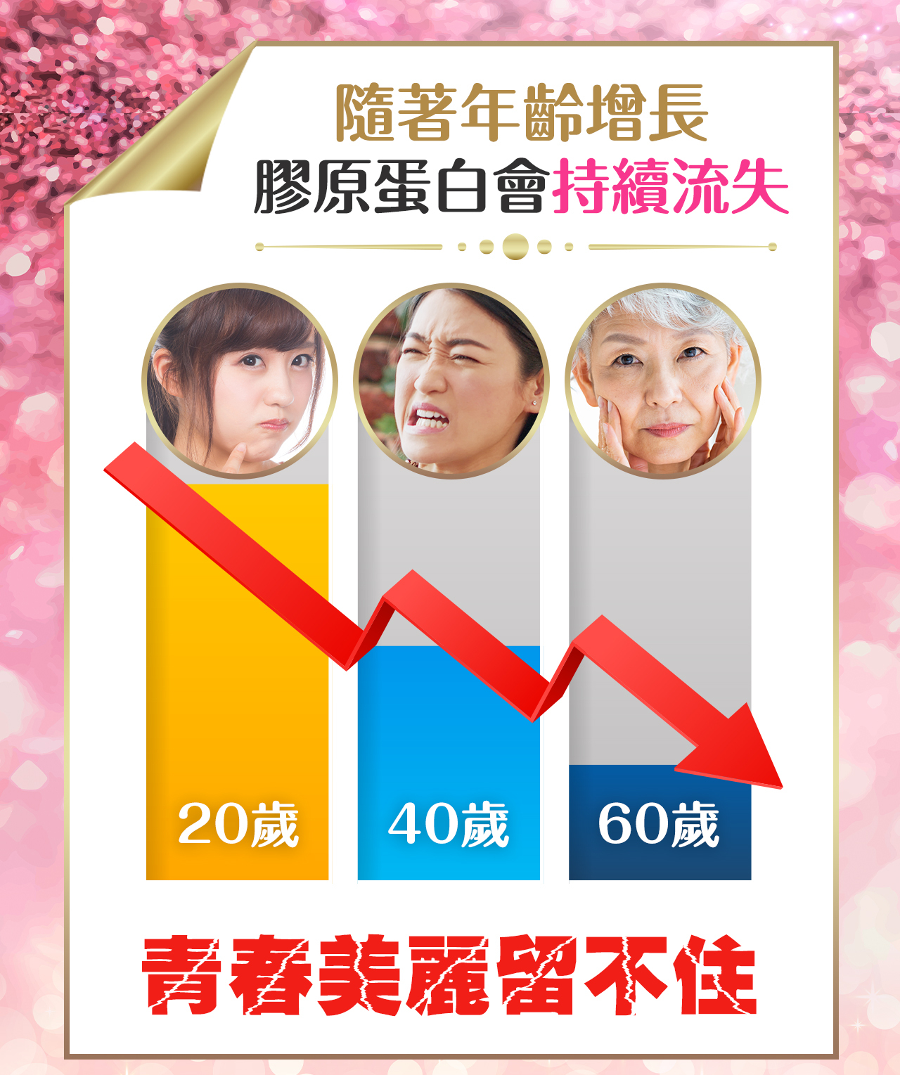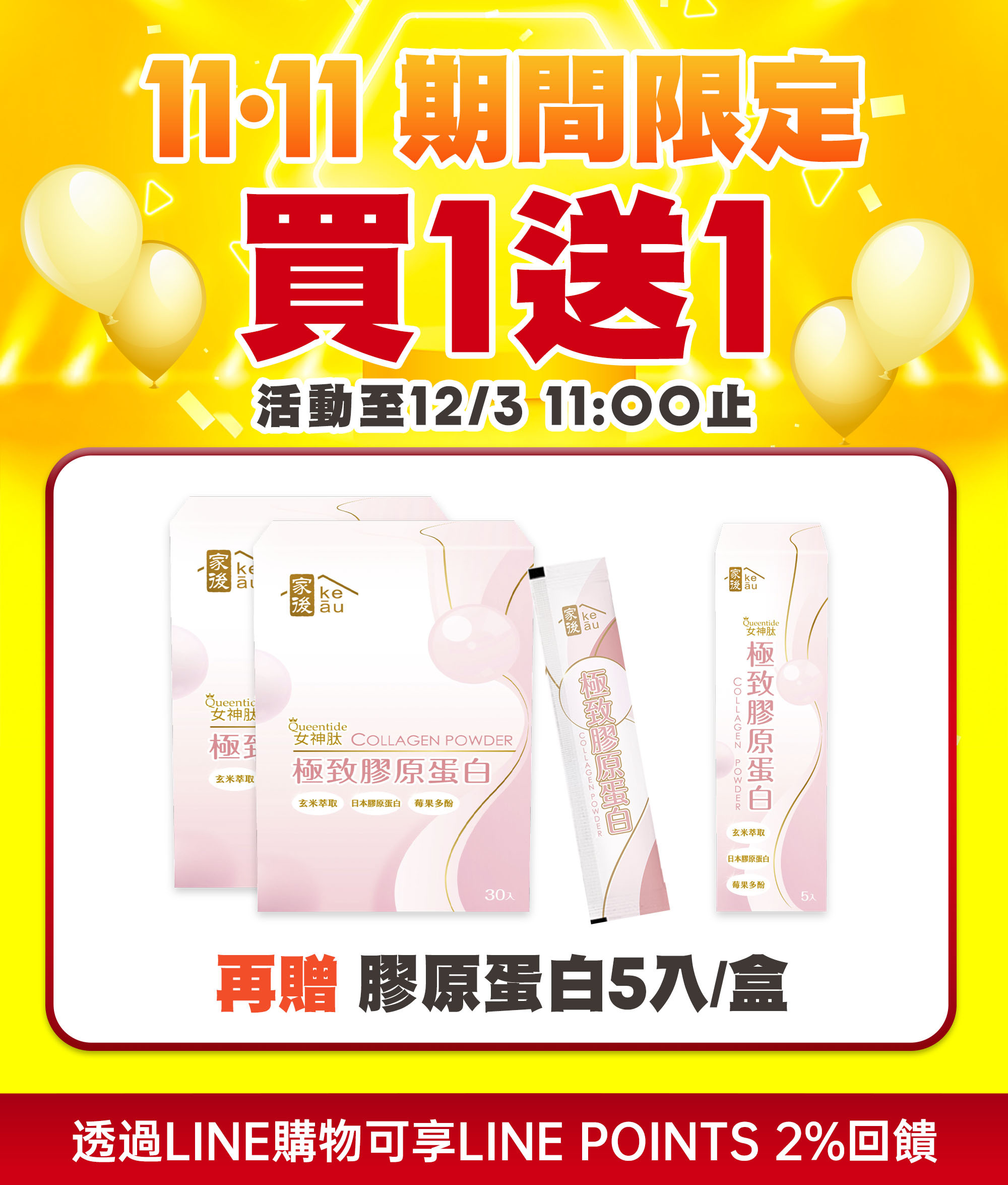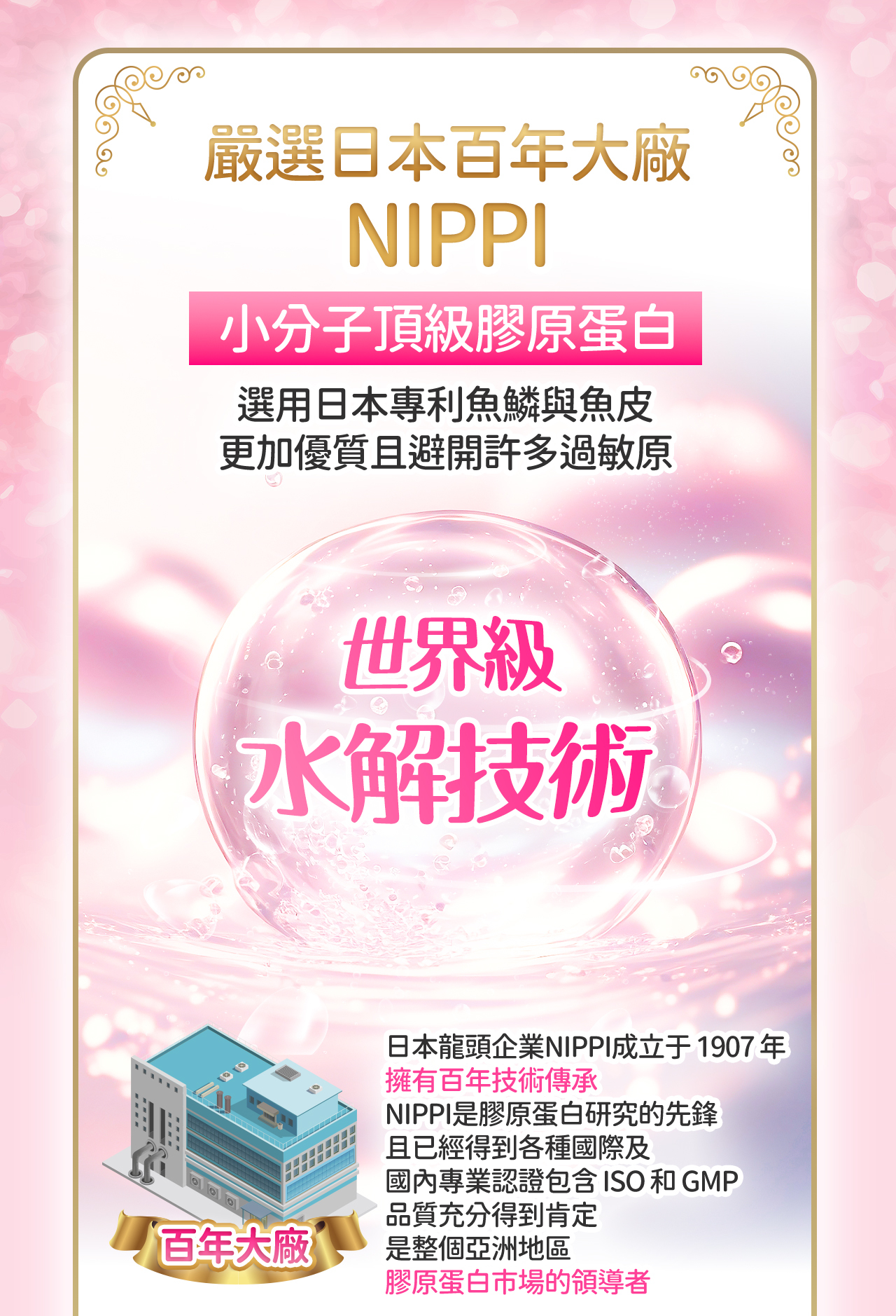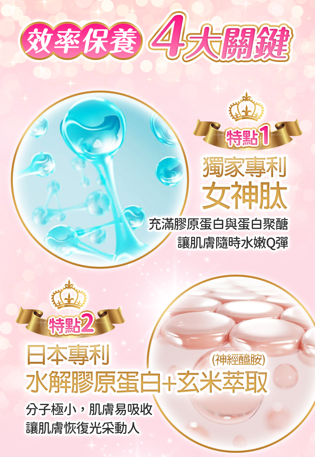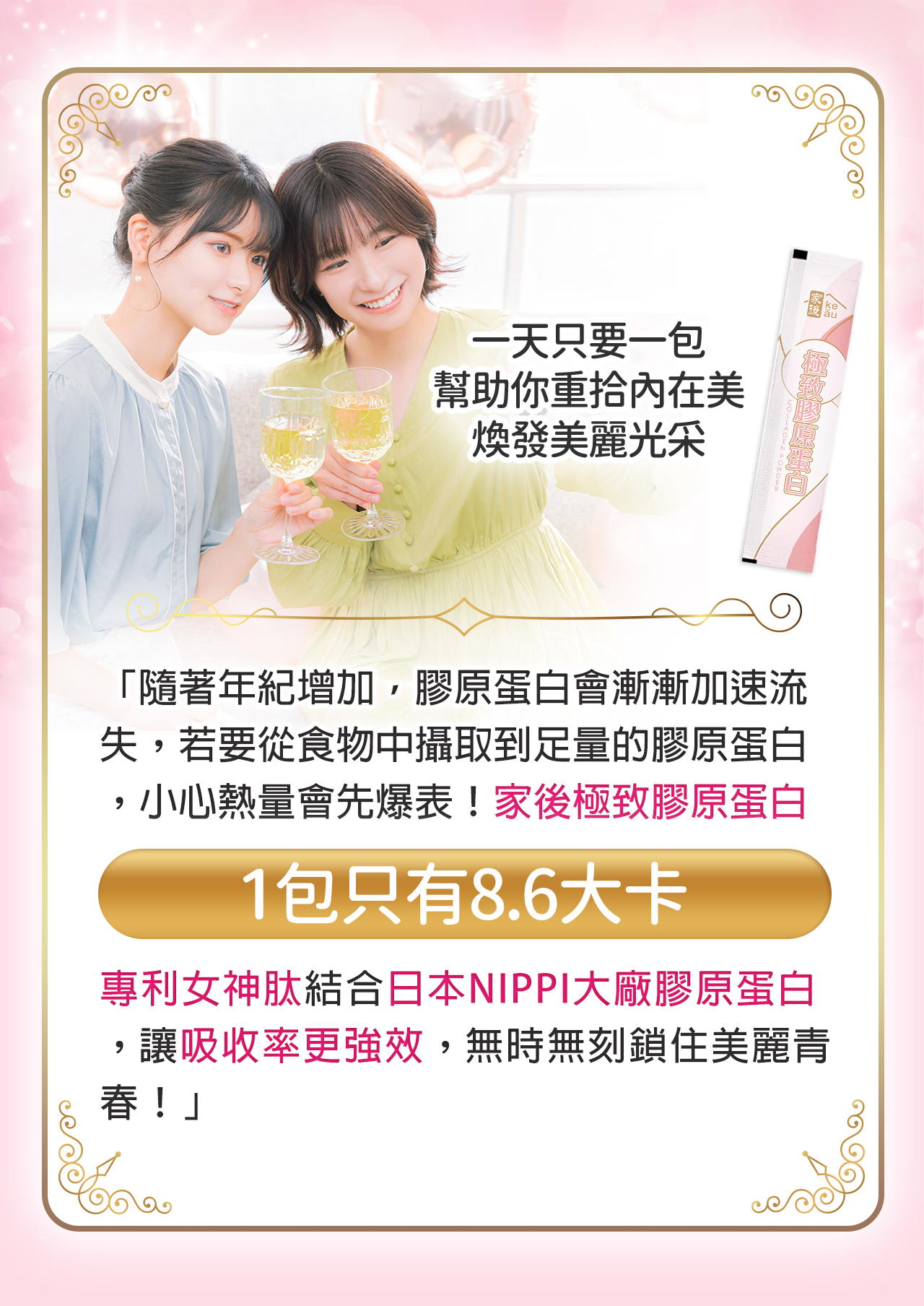 | 成分 | 日本魚鱗膠原蛋白、玉米來源可溶性纖維、綜合莓果發酵物(樹薯來源難消化性麥芽糊精(水溶性膳食纖維)、樹薯來源麥芽糊精、接骨木莓、野櫻莓、巴西莓、山桑子、黑醋栗、覆盆莓、黑莓、藍莓、波森莓、蔓越莓、楊梅、枸杞、余甘子、草莓、桑椹、麥芽糊精)、膠原蛋白水解胜肽(豬來源)、複方維生素 C(L-抗壞血酸、柑橘萃取、米糠粉)、日本玄米萃取(含赛洛美)(玉米糊精、米抽出物) |