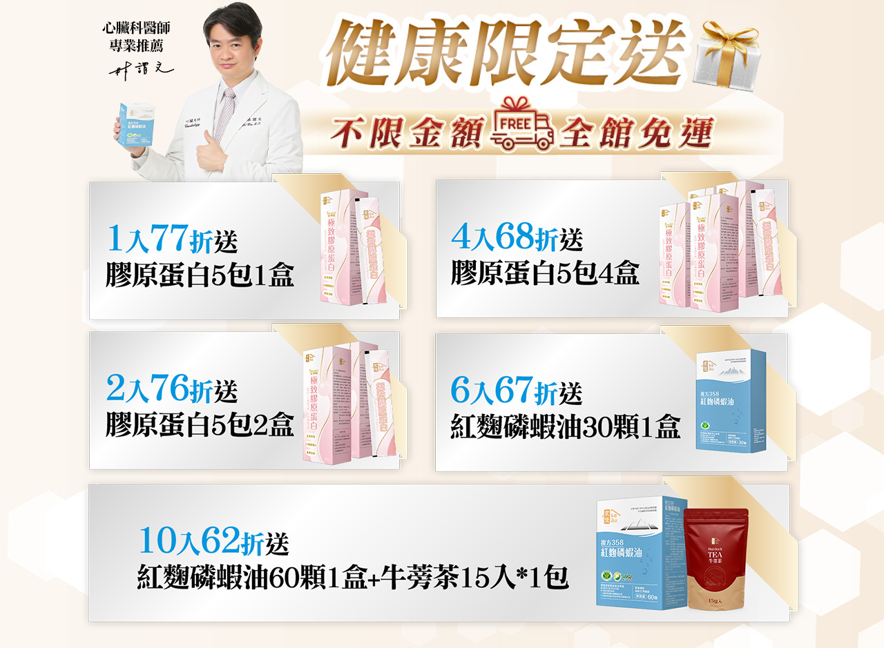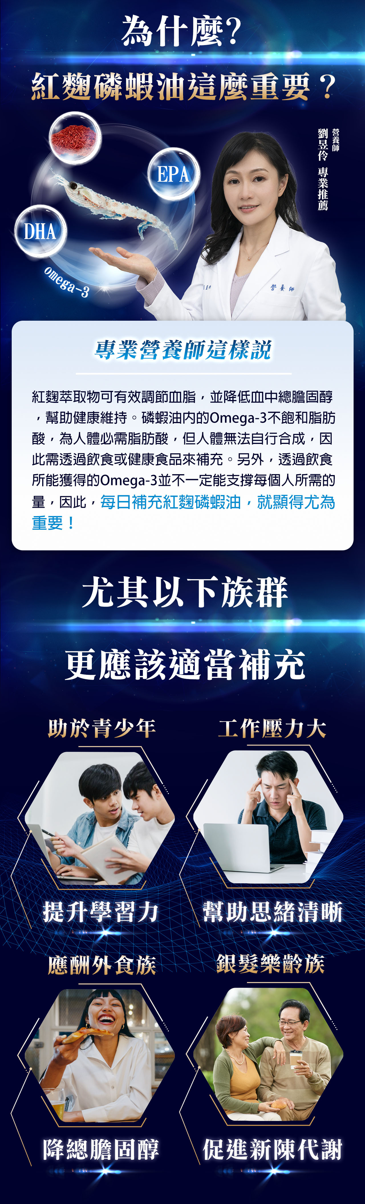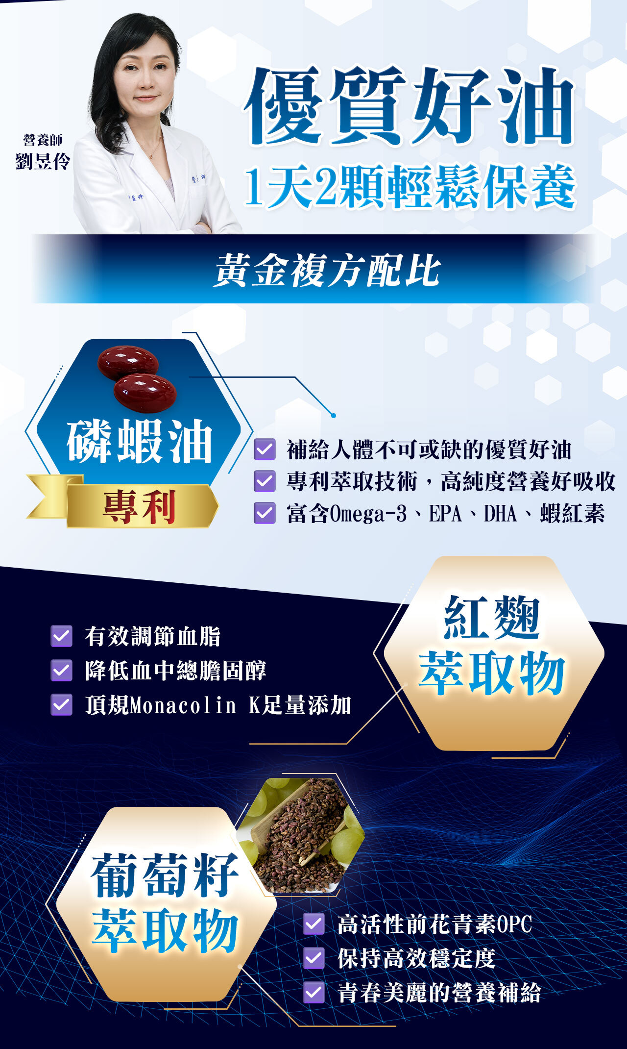 | 產品成分 | 內容物成分:磷蝦油、紅麴萃取物、脂肪酸甘油酯、葡萄籽萃取物、維生素E(抗氧化劑) 膠囊成分:明膠、甘油、純水、食用紅色六號、食用黃色四號、二氧化鈦、食用藍色一號 |